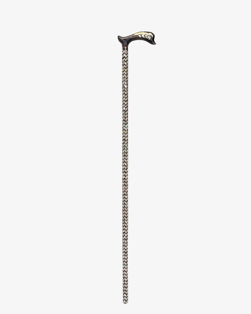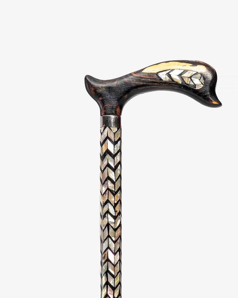 A crutch made of luxurious Ebanus wood, professionally engraved with natural mother-of-pearl, with a longitudinal handle, handmade by the most skilled craftsmen specialized in manufacturing crutches from natural wood. It has been professionally polished, multi-use, lightweight, 94 cm long, suitable for social occasions for all tastes.