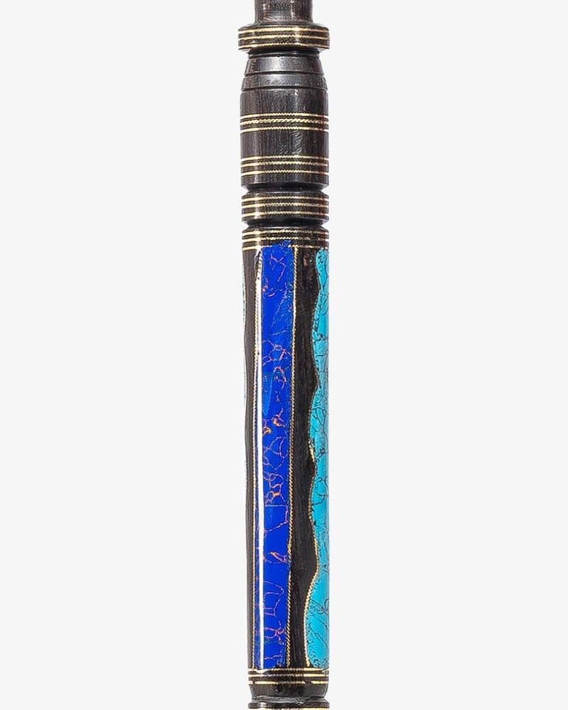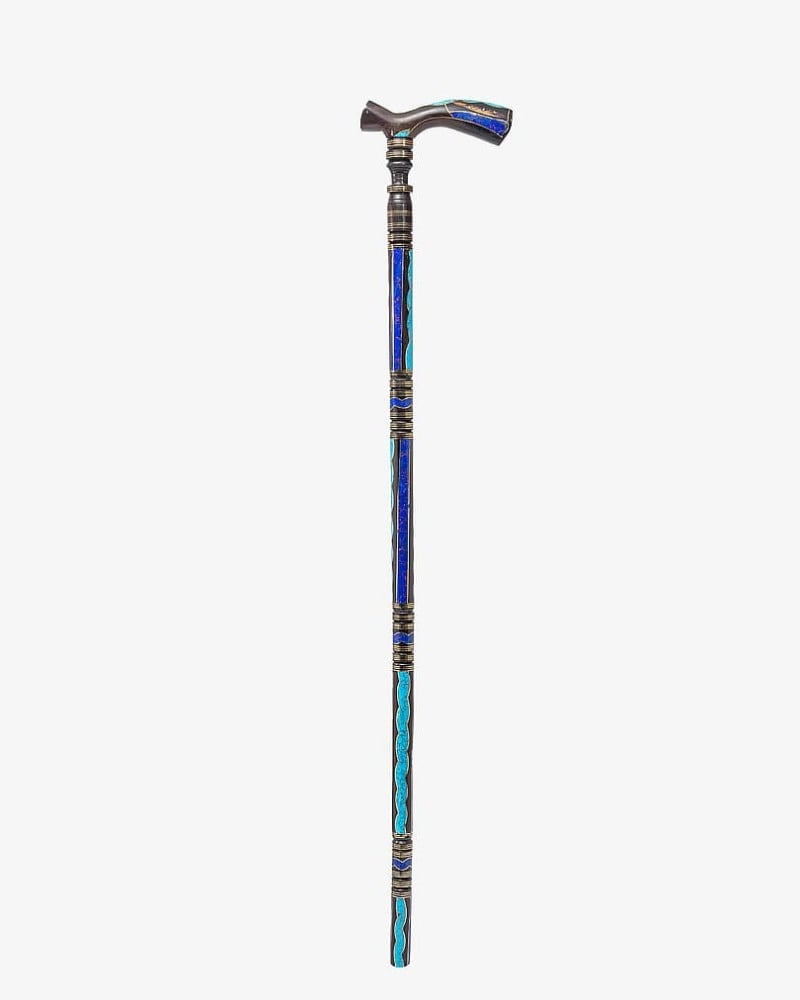 A crutch made of natural Ebanus wood inlaid with a similarity to turquoise and lapis lazuli, professionally engraved with copper and metal, soft to the touch, with a longitudinal handle, handmade by the most skilled craftsmen specialized in manufacturing crutches from natural wood, and professionally polished, multi-use, thick, suitable for social occasions for all tastes.