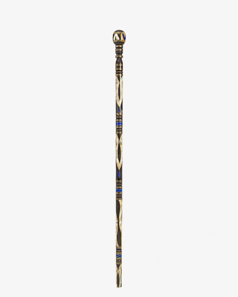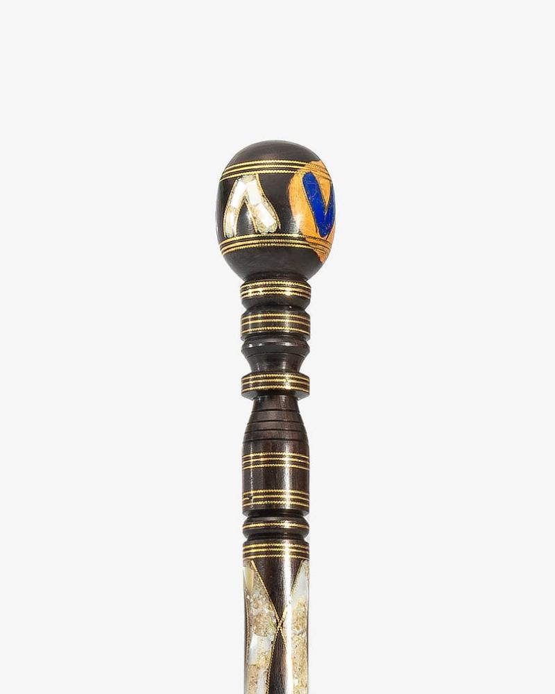 A crutch cane made of elegant natural ebony wood, professionally engraved with a lapis lazuli-like and natural mother-of-pearl, with a soft-touch, circular handle, handmade by the most skilled craftsmen specialized in manufacturing crutches from natural wood. It has been professionally polished for multiple uses, thick and 97 cm long, suitable for social occasions for all tastes.