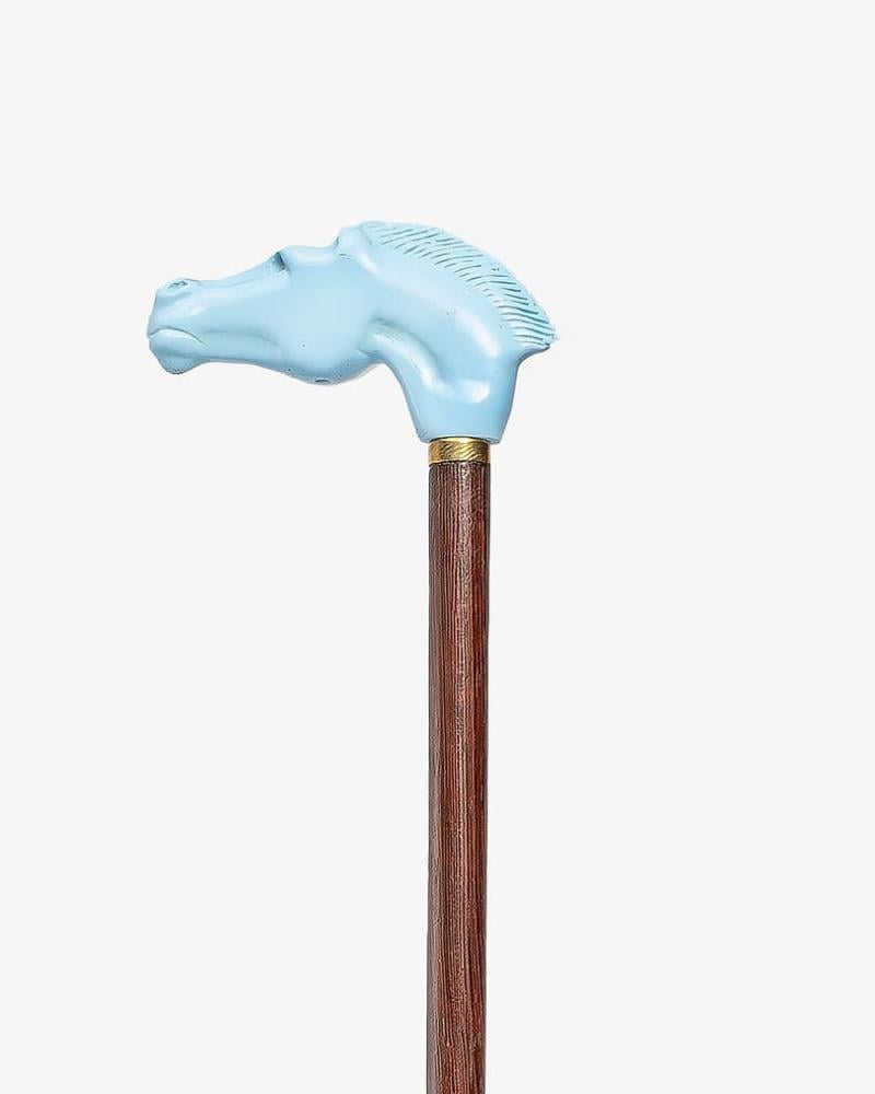 Natural ebony wood crutch, with a sky blue Bakelite handle engraved with a soft horse head, handmade by the most skilled craftsmen specialized in manufacturing natural wood crutches, and professionally polished, multi-use, lightweight, 96 cm long, suitable for social occasions for all tastes