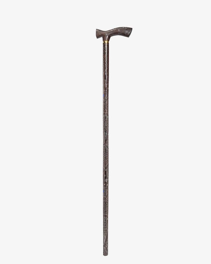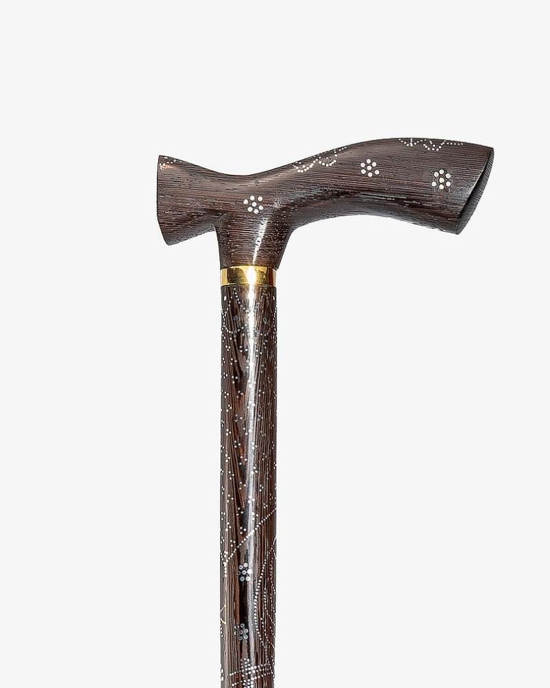 A crutch made of natural ebony wood, decorated with a lapis lazuli-like stone and a soft-touch copper engraving, with a longitudinal handle, handmade by the most skilled craftsmen specialized in manufacturing crutches made of natural wood. It has been professionally polished and has multiple uses, 94 cm long and thick. It is suitable for social occasions for all tastes.