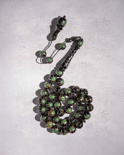 A luxurious bronze stone rosary in brown color, characterized by its perfect smooth circular design and polished to perfection. It comes in attractive colors that highlight the elegance and strength of its owner, with a soft touch that gives it a special charm. This rosary is ideal for showing good taste and elegance, and is considered one of the most beautiful types of bronze rosaries in its beauty and elegance. It suits all tastes and ages, and adds a formal and distinctive touch to its owner's appearance.