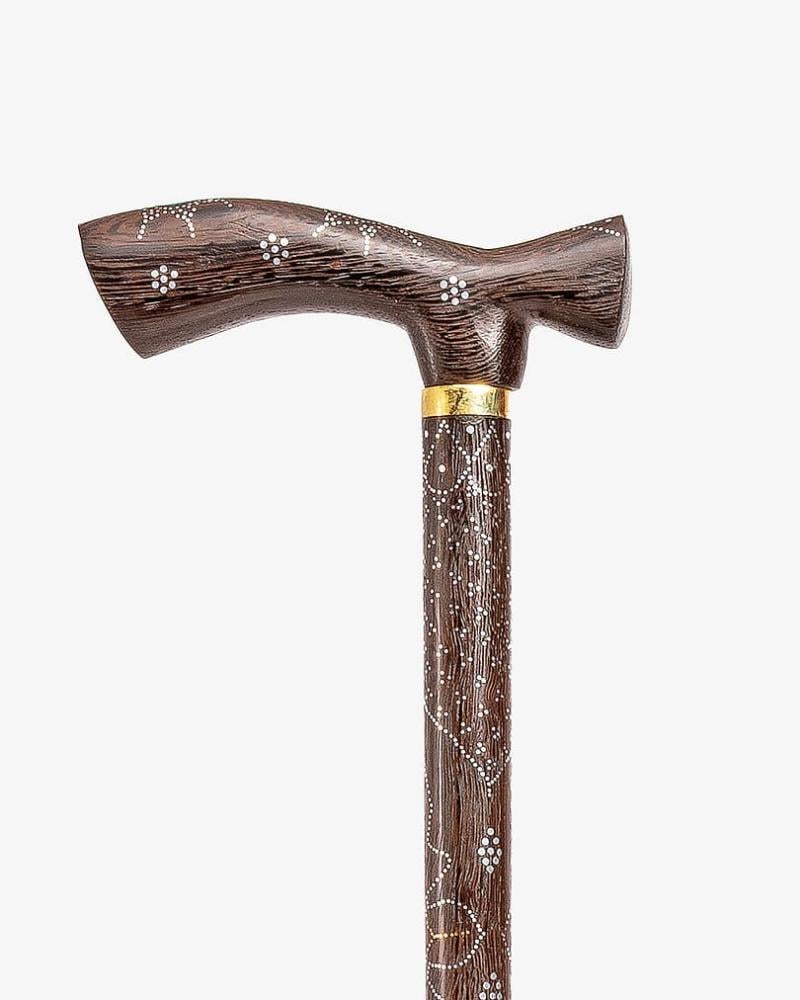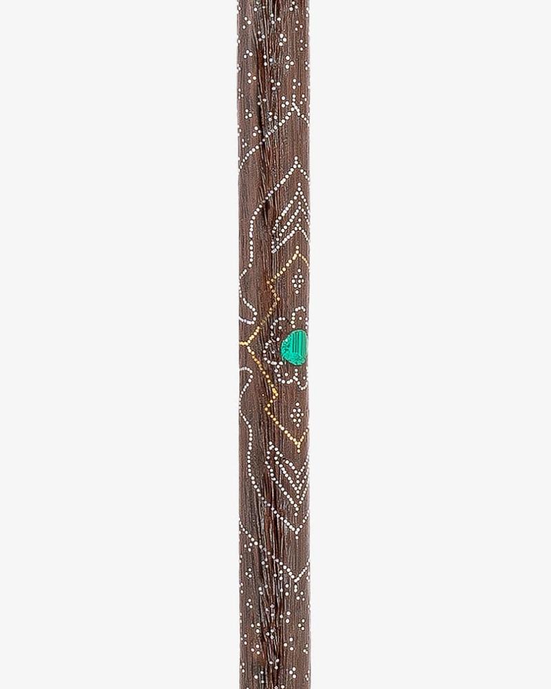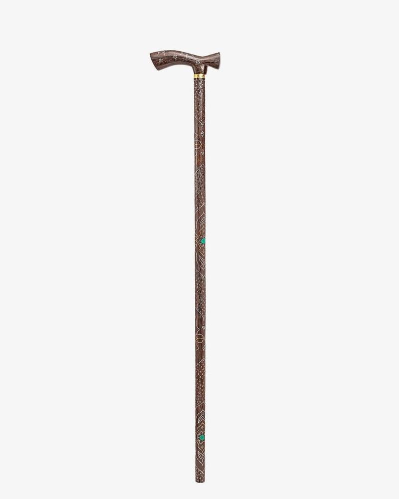 A crutch made of natural Vengean wood, with a malachite-like stone and a soft-touch copper engraving, with a longitudinal handle, handmade by the most skilled craftsmen specialized in manufacturing crutches made of natural wood. It has been professionally polished for multiple uses, 94 cm long and thick, suitable for social occasions for all tastes.