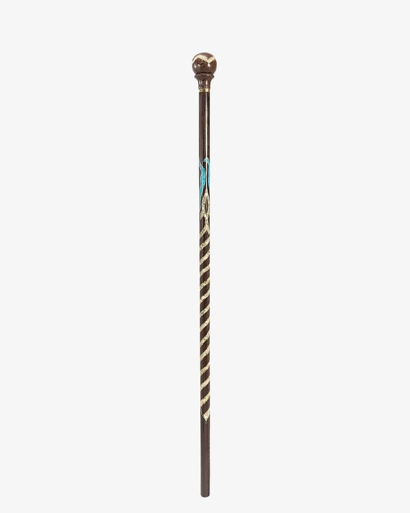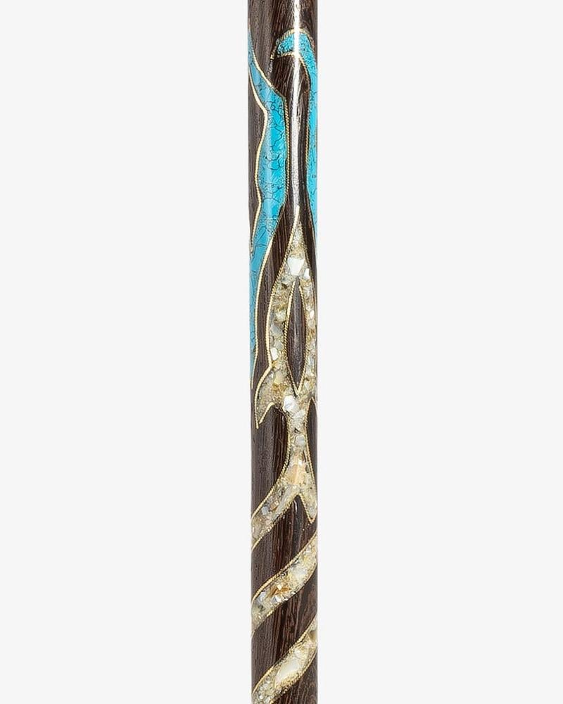 A luxurious crutch stick made of natural Venge wood, decorated with a turquoise-like appearance, mother-of-pearl and professionally polished metal with a soft texture, with a round handle handcrafted by the most skilled craftsmen specialized in manufacturing crutches from natural wood. It has been professionally polished, multi-use, thick, and 97 cm long, suitable for social occasions for all tastes.