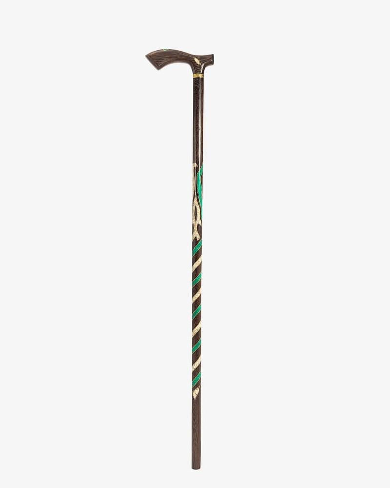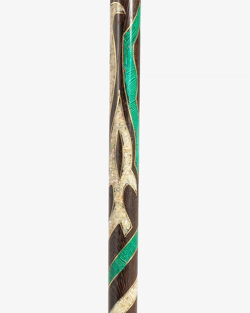 A luxurious crutch stick made of natural Venge wood, decorated with malachite-like, mother-of-pearl and professionally polished metal with a soft texture, with a longitudinal handle handcrafted by the most skilled craftsmen specialized in manufacturing crutches from natural wood. It has been professionally polished, multi-use, thick, 95 cm long, suitable for social occasions for all tastes.