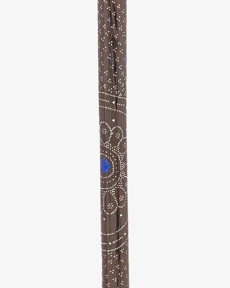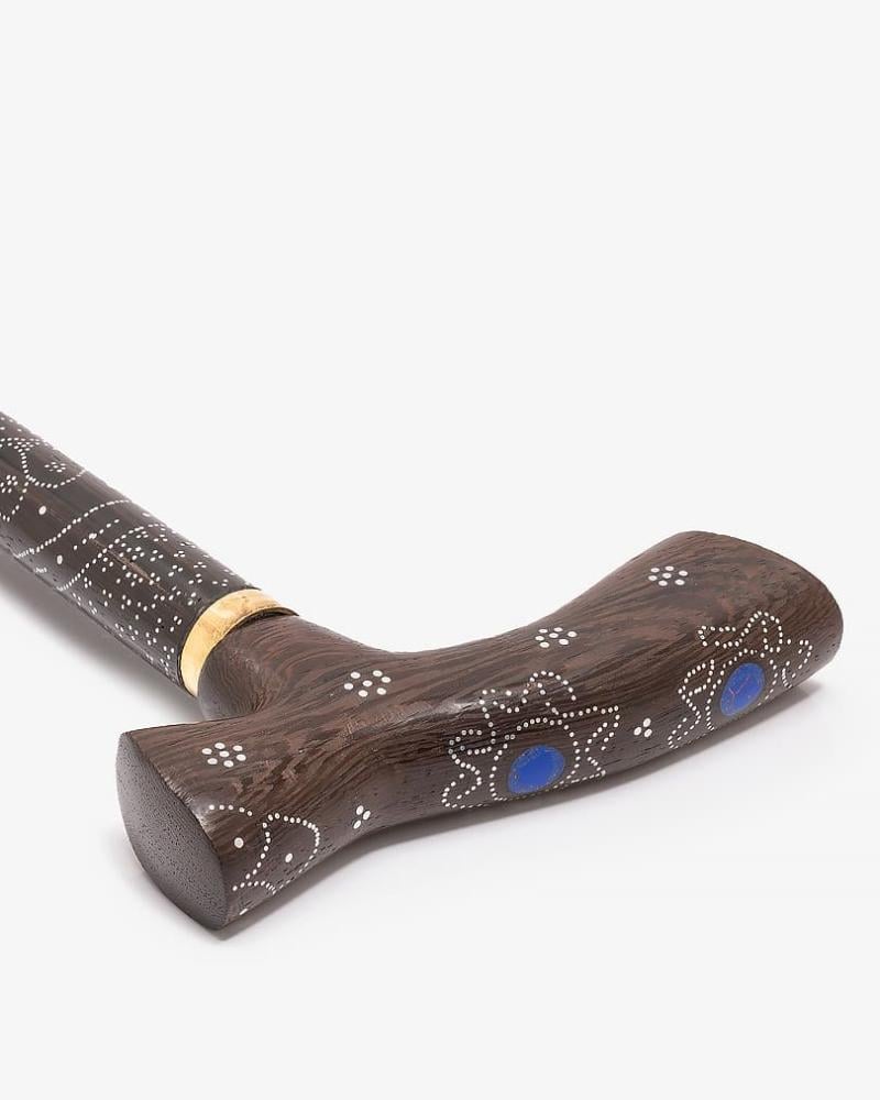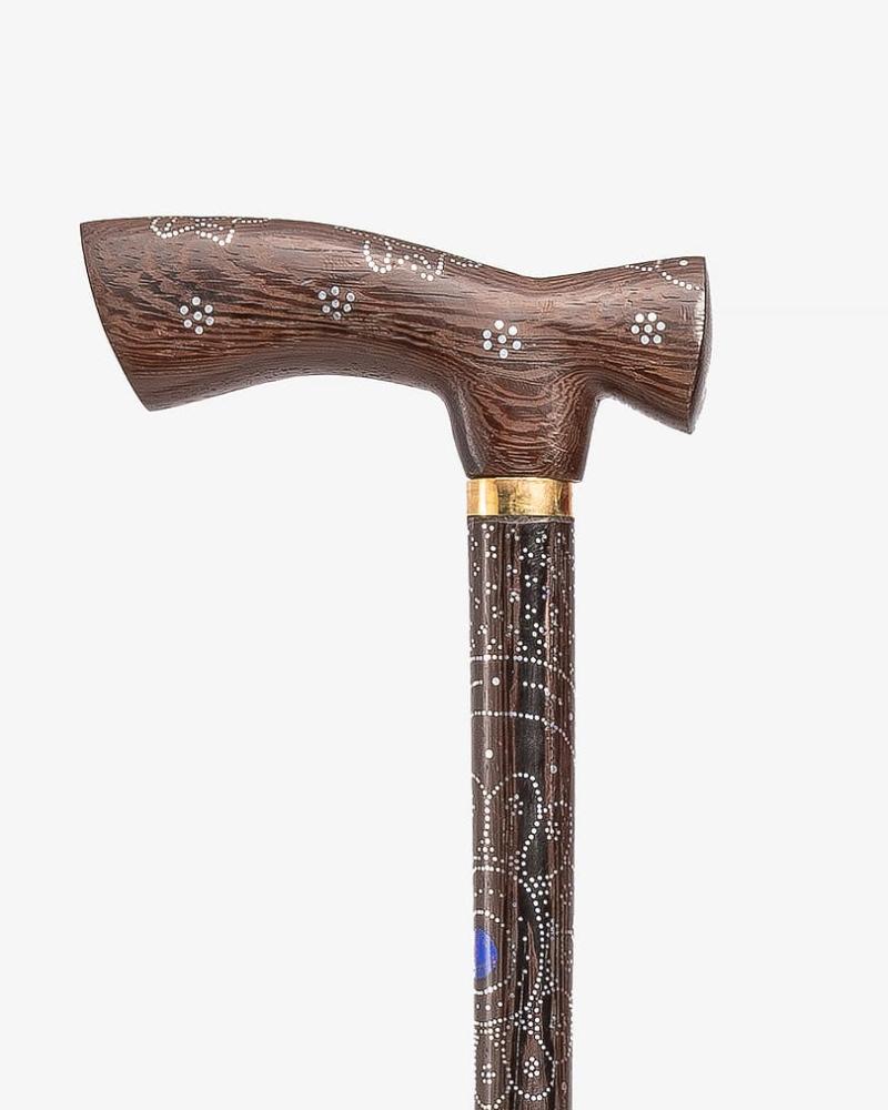 A crutch made of natural Vengean wood, decorated with a lapis lazuli-like stone and a soft-touch copper engraving, with a longitudinal handle, handmade by the most skilled craftsmen specialized in manufacturing crutches made of natural wood. It has been professionally polished for multiple uses, 94 cm long and thick, suitable for social occasions for all tastes.