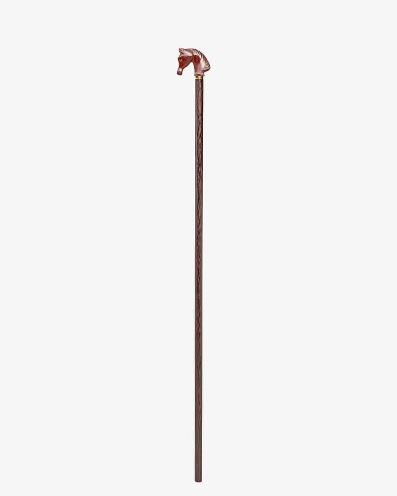 A crutch made of natural Venge wood, with a brown bakelite handle carved in the shape of a horse's head, soft to the touch, handmade by the most skilled craftsmen specialized in manufacturing crutches made of natural wood, and professionally polished, multi-use, lightweight, 95 cm long, suitable for social occasions for all tastes.