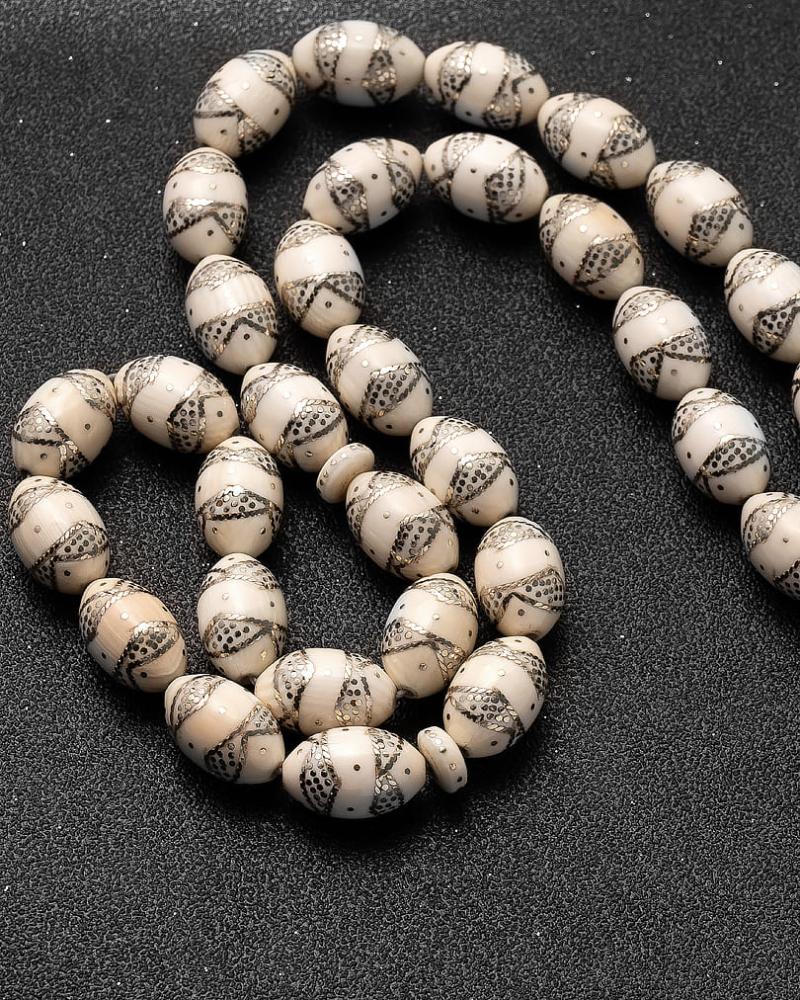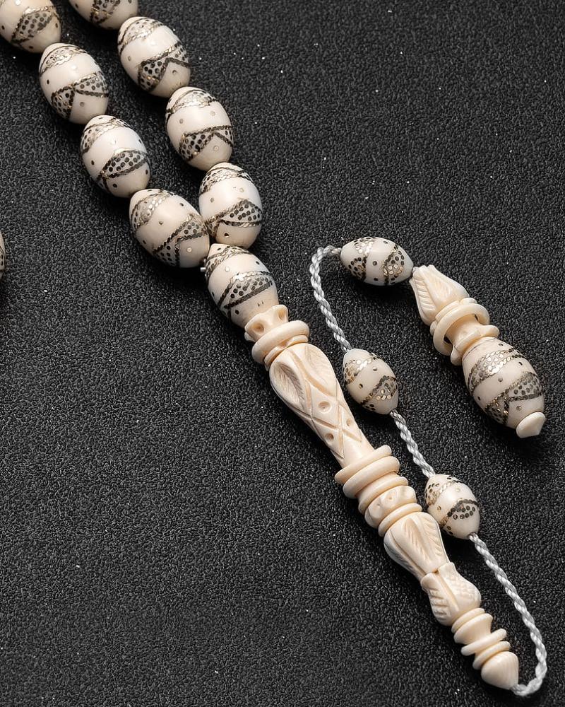 A luxurious and rare rosary made of ivory (elephant tusk) engraved with pure 925 silver, featuring a homogeneous oval shape that makes it look like no other. This rosary is handcrafted to highlight the elegance and luxury of its owner, and add a touch of elegance and beauty to his appearance. The ivory used in its manufacture retains its quality and beauty for a long time, making it a unique and elegant piece that adds a touch of luxury to any look. A wonderful design that suits all tastes and adds a touch of beauty and distinction to your appearance. There is no doubt that this rosary will be a wonderful and distinctive addition to your personal collection.