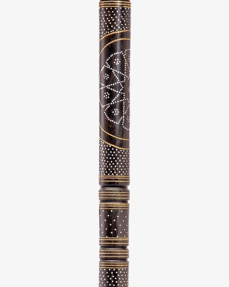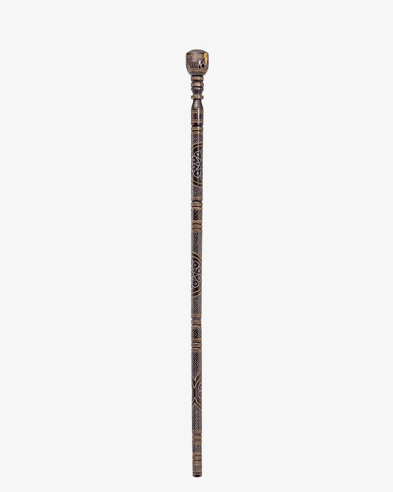 A luxurious crutch stick made of natural Ebanus wood, professionally engraved with copper and metal, soft to the touch, with a round handle, handmade by the most skilled craftsmen specialized in manufacturing crutches from natural wood, and professionally polished for multiple uses, thick, 98 cm long, suitable for social occasions for all tastes.