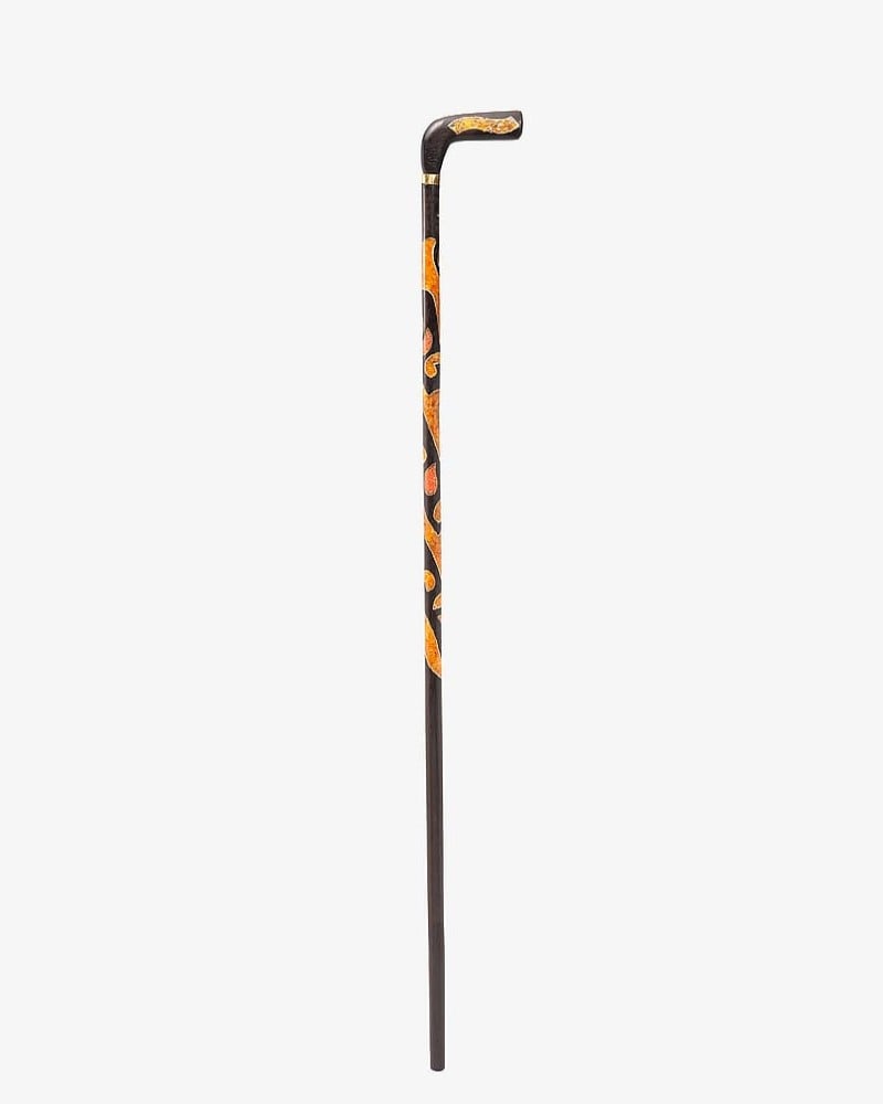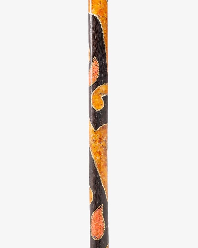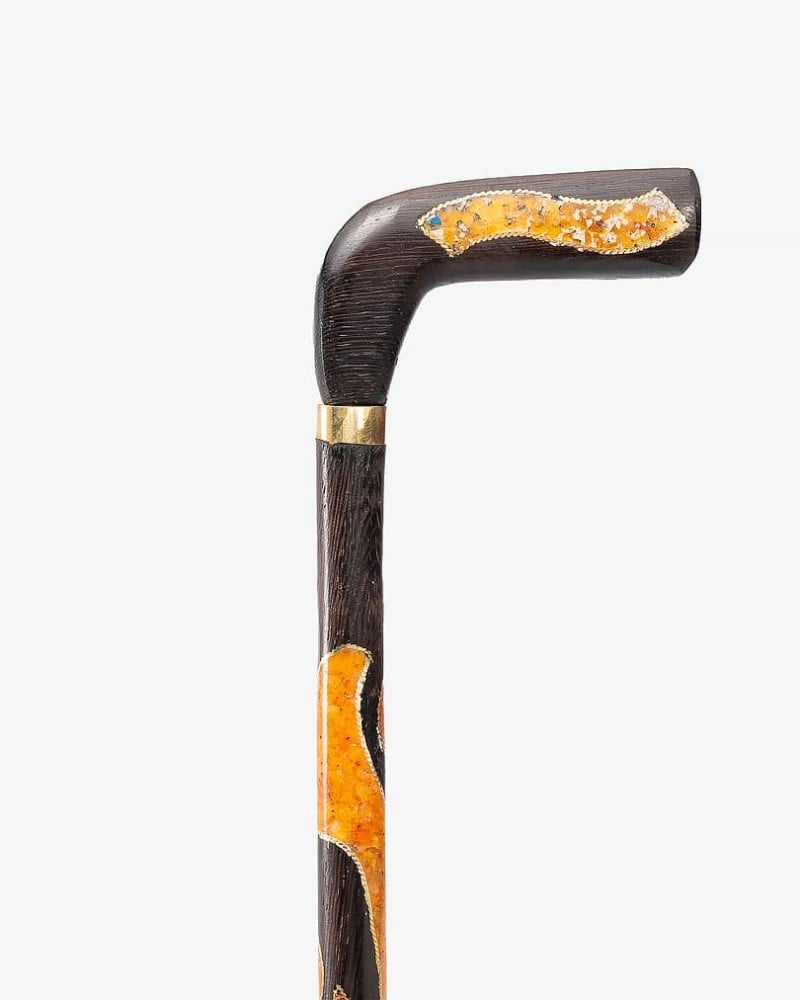 A luxurious brown crutch made of natural ebony wood, decorated with amber-like and red coral, with a longitudinal handle engraved with soft copper, hand-crafted and expertly polished by the most skilled craftsmen specialized in manufacturing crutches from natural wood, multi-use, lightweight, 93 cm long, suitable for social occasions for all tastes