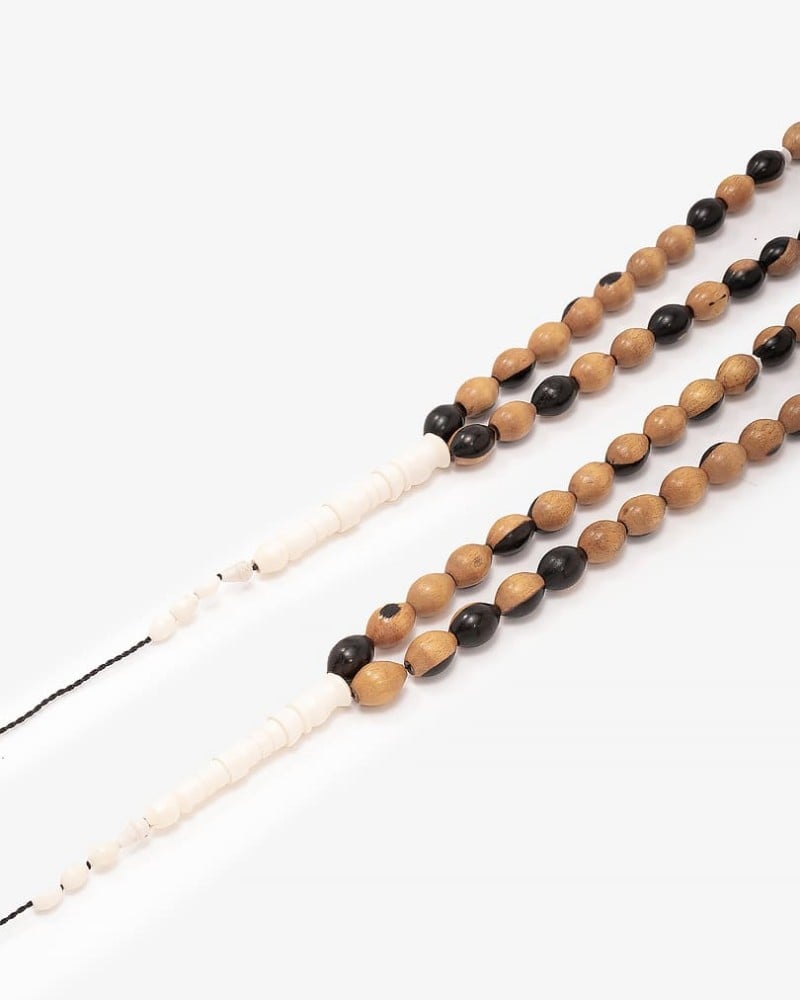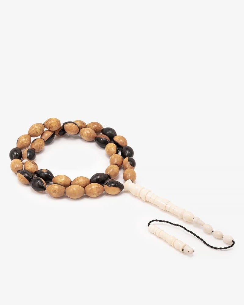 A rosary made of natural ebony wood and camel bone, distinguished by its beautiful details, carved in a wonderful and skillful way. Olive in shape, soft to the touch, designed to show the elegance of its owner, his strong presence, elegance and high taste. The thread is strong and cohesive, with 33 beads, 10 mm, weighing 29 grams, to suit all tastes and ages.