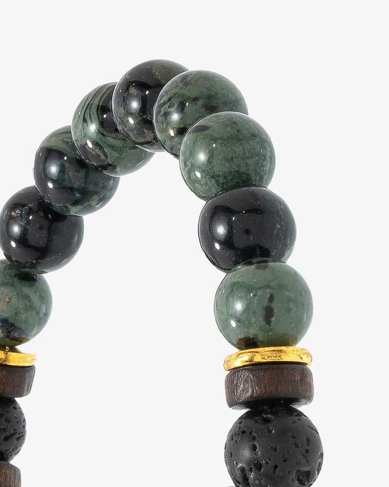 A stylish modern wristband with green seraphinite stone, decorated with lava stone and metal spacers, expertly crafted in a round shape with a soft texture, featuring an 8mm circular closure around the wrist that keeps it securely fastened, designed to complement the elegance of any outfit with a touch of sophistication, suitable for all tastes.