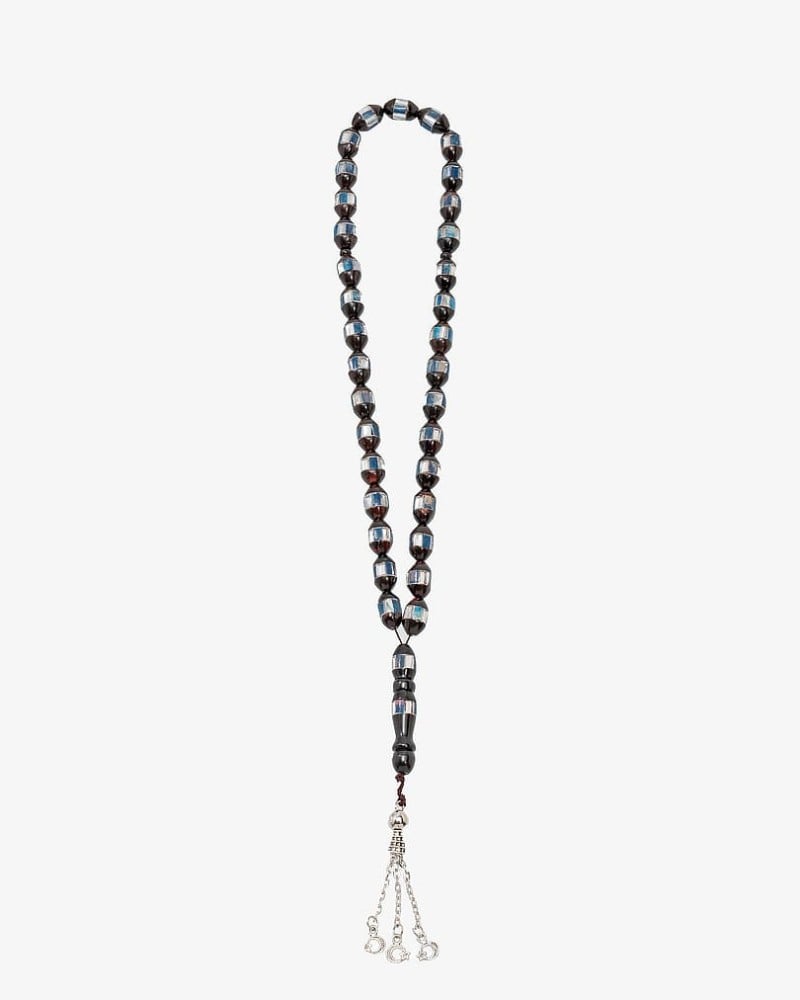 Natural cocoa wood rosary decorated with blue mirrors. With a smooth, homogeneous oval cut, designed to show the elegance of its owner, it is distinguished by the fact that it retains the scent of perfume for a long time. One of the most famous rosaries distinguished by its wood that lasts a long time with the same quality. It has 33 beads, 9 mm, weighing 32 grams. Beautiful, elegant and formal in its color and appearance for a distinctive extension to suit all tastes.