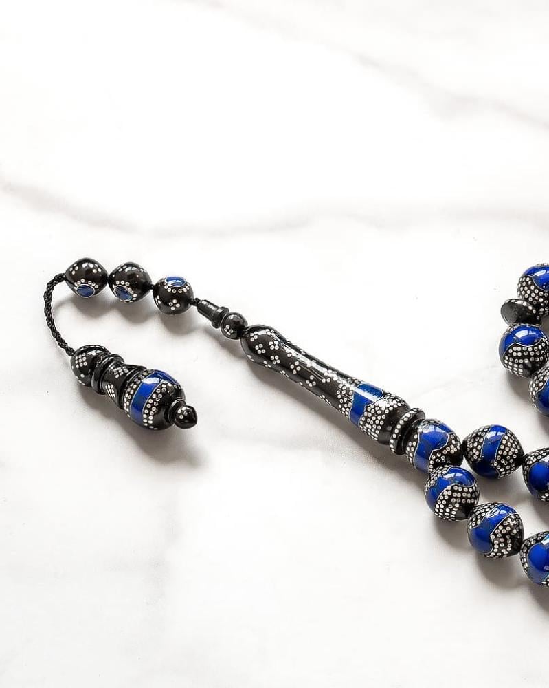 A rare rosary made of natural cocoa wood decorated with silver and natural lapis lazuli stone, with a smooth, homogeneous oval cut, decorated with a silver-inlaid tassel, designed to show the elegance of its owner. It is distinguished by the fact that it retains the scent of perfume for a long time. One of the most famous rosaries distinguished by its wood that lasts for a long time with the same quality, beautiful, elegant and formal in its color and appearance for a distinctive extension to suit all tastes.
