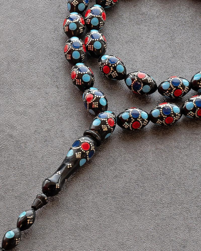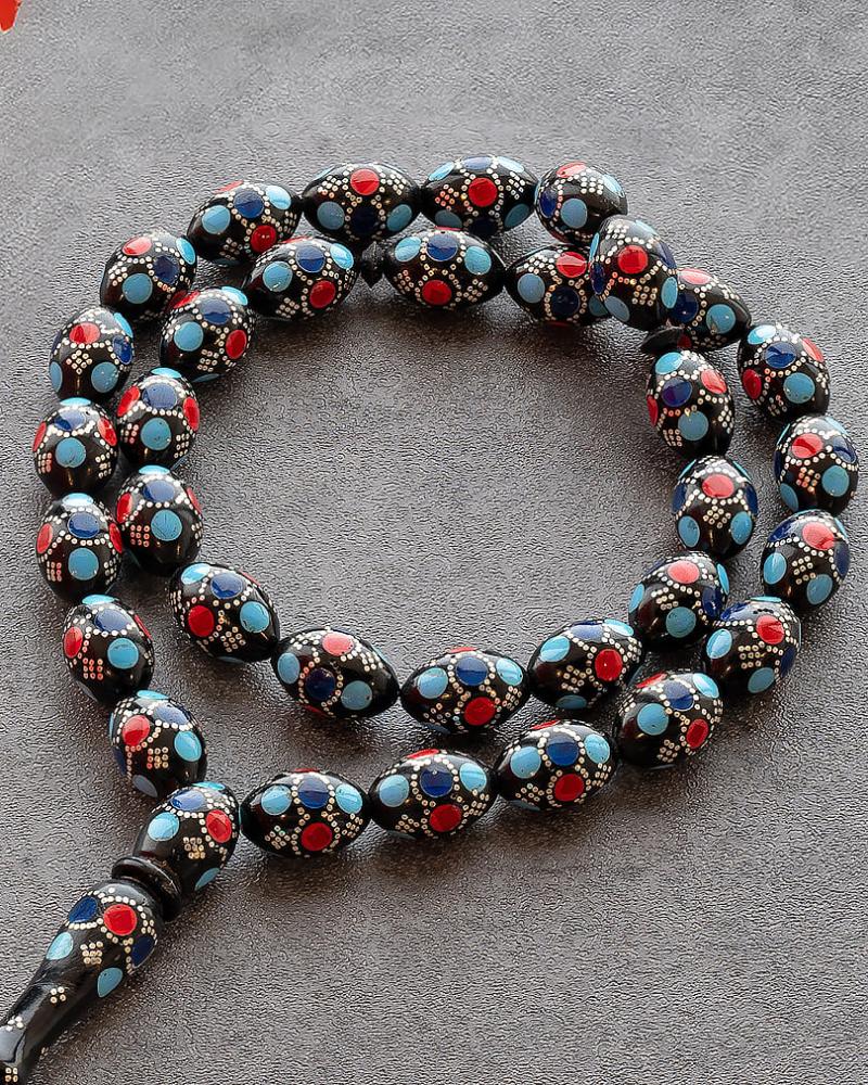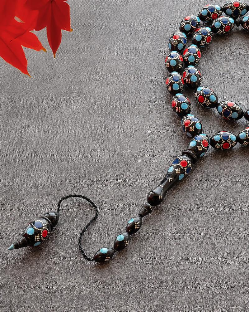 Natural cocoa wood rosary decorated with 925 sterling silver, decorated with turquoise, lapis lazuli and coral-like stones, with a smooth, homogeneous oval cut, designed to show the elegance of its owner, characterized by the fact that it retains the scent of perfume for a long time. One of the most famous rosaries distinguished by its wood that lasts a long time, carrying the same quality. It has 33 9 mm beads, weighing 36 grams. It is beautiful, elegant and formal in its color and appearance for a distinctive extension to suit all tastes.