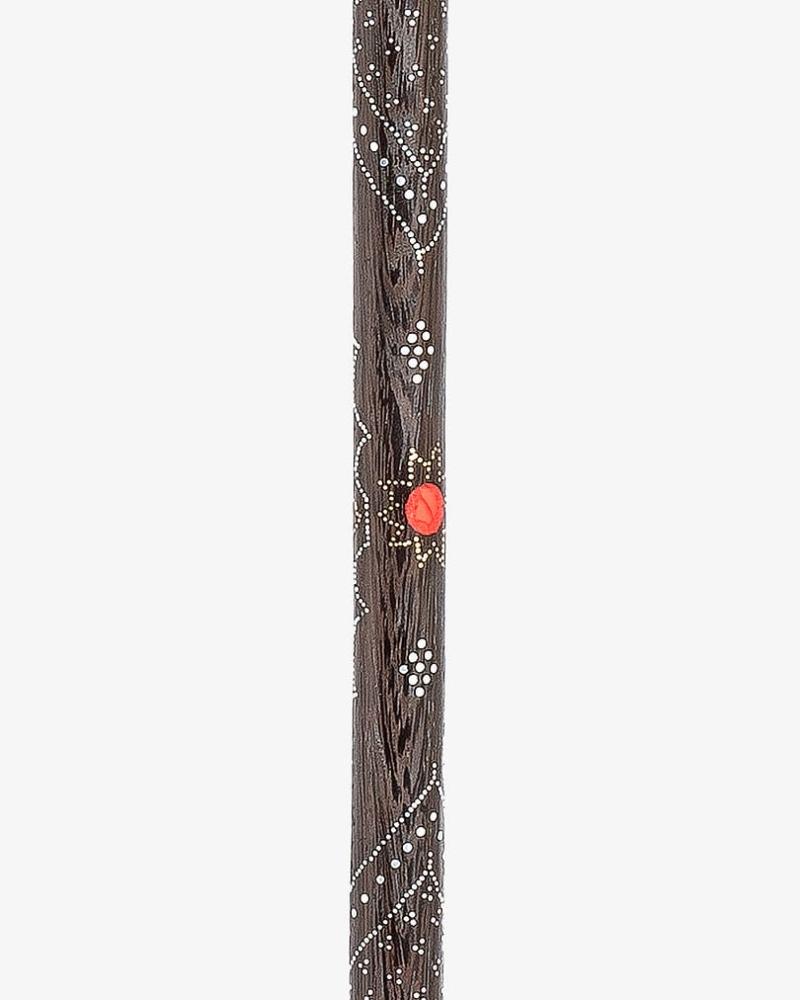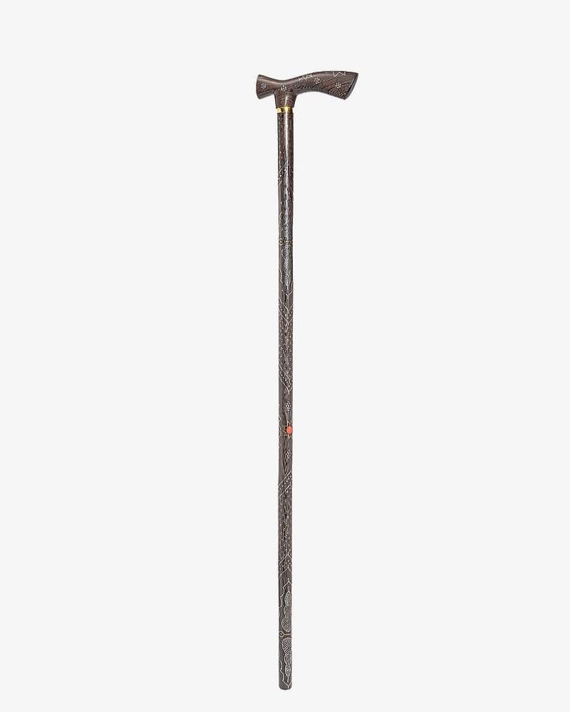 A crutch made of natural ebony wood, decorated with a red coral-like appearance and a soft-touch copper engraving, with a longitudinal handle, handmade by the most skilled craftsmen specialized in manufacturing crutches from natural wood. It has been professionally polished and has multiple uses, 94 cm long and thick, suitable for social occasions for all tastes.