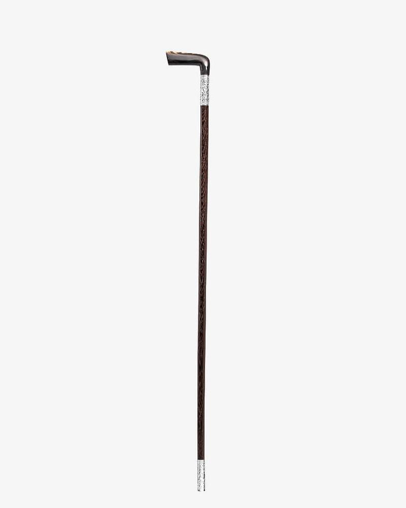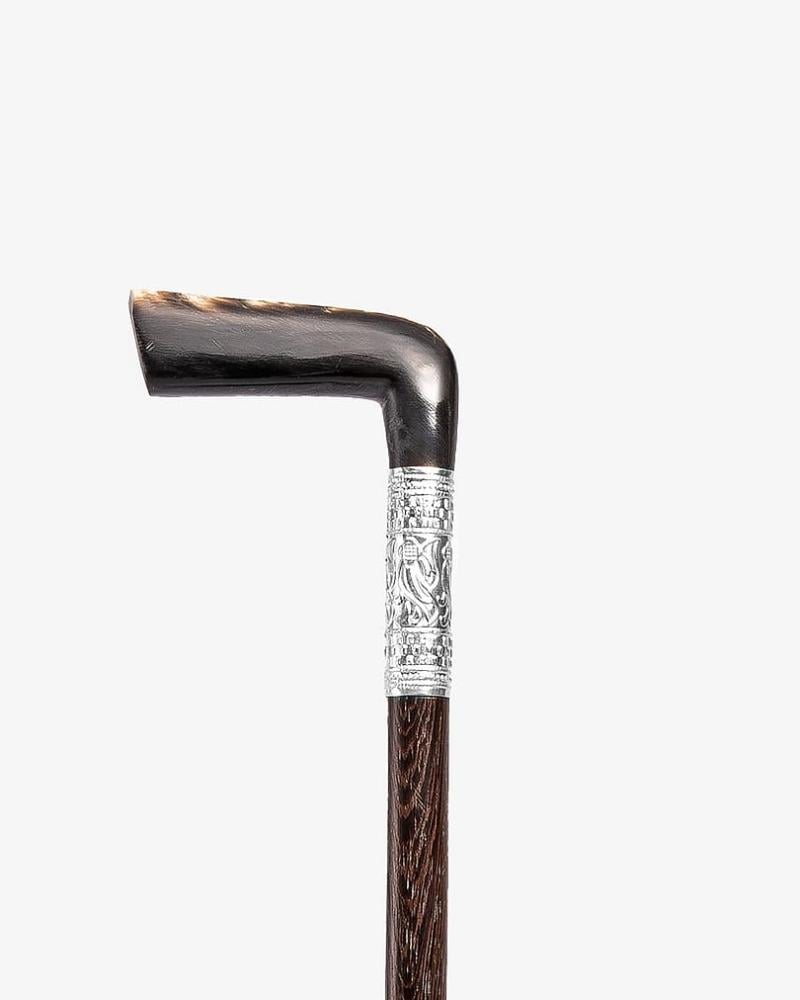A crutch made of natural ebony wood, engraved with 925 silver, with a longitudinal handle made of brown buffalo horn, soft to the touch, handmade by the most skilled craftsmen specialized in manufacturing crutches from natural wood, and professionally polished, multi-use, lightweight, 94 cm long, suitable for social occasions for all tastes.