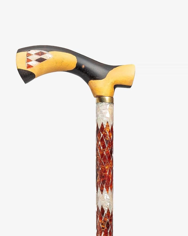 A crutch made of luxurious natural ebony wood, decorated with soft-touch artificial mother-of-pearl, expertly polished with a longitudinal handle, handmade by the most skilled craftsmen specialized in manufacturing artificial wood crutches, and professionally polished, multi-use, 96 cm long and thick, suitable for social occasions for all tastes.