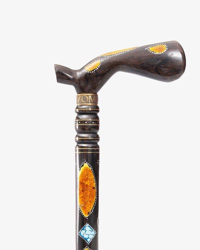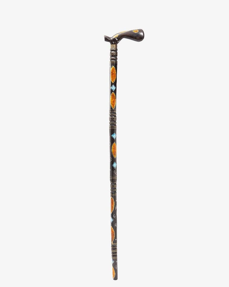 An elegant crutch made of natural ebony wood, decorated with amber and turquoise-like decorations, engraved with copper, with a soft-touch longitudinal handle, handmade by the most skilled craftsmen specialized in manufacturing crutches from natural wood, and professionally polished, multi-use, can be disassembled and assembled, 94 cm long, wide thickness, suitable for social occasions for all tastes