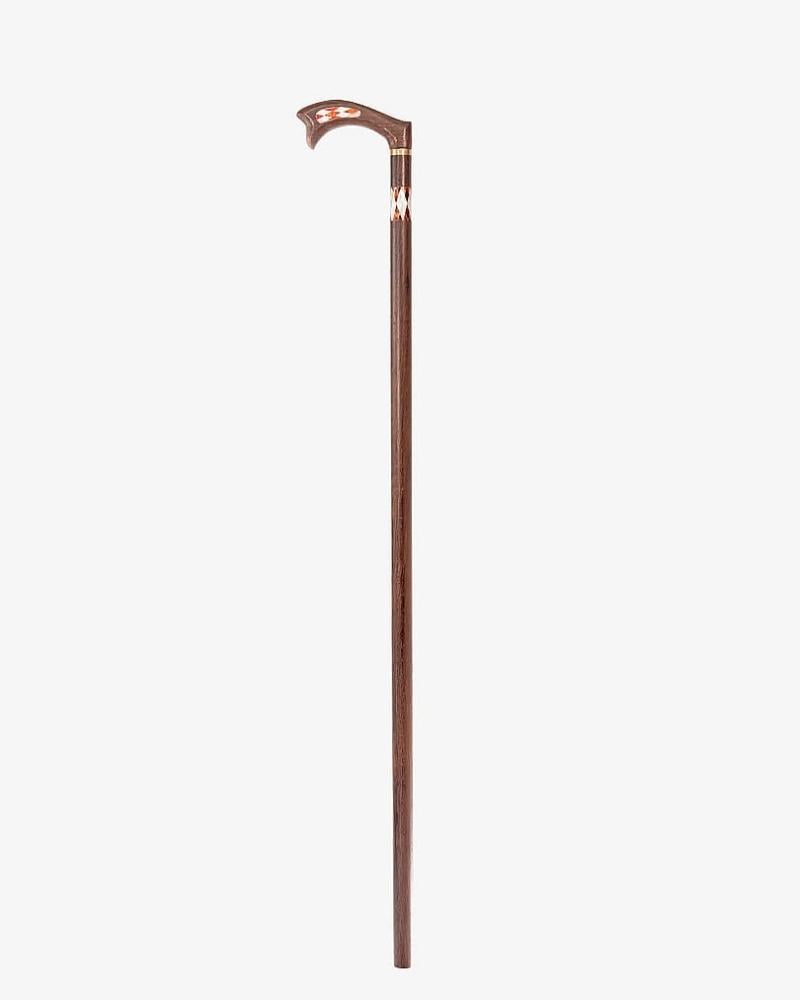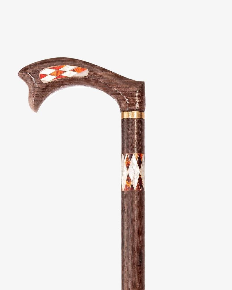 A crutch cane made of elegant natural Venge wood, professionally inlaid with mother-of-pearl, with a longitudinal handle, handmade by the most skilled craftsmen specialized in manufacturing crutches made of natural wood. It has been professionally polished, has multiple uses, and is 95 cm long. It is suitable for social occasions for all tastes.