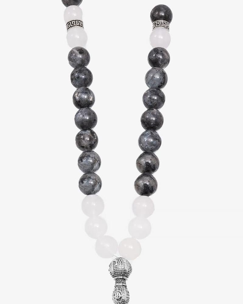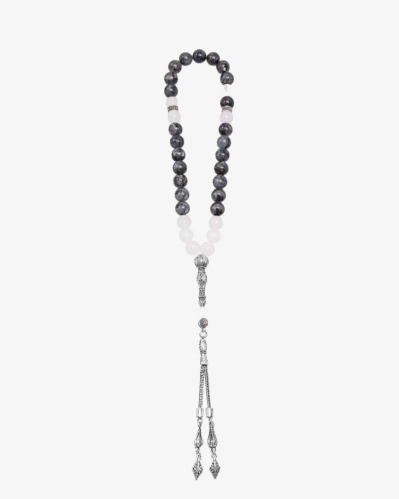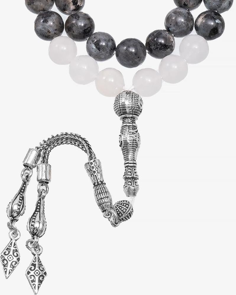 Labradorite and white quartz stone rosary, the stone is expertly polished, round in shape, smooth in texture, with attractive colors, designed to show the elegance of its owner, his strong presence, elegance, and high taste. It is one of the most beautiful, elegant, and formal types of Labradorite and white quartz stone rosaries in its color and appearance. It is ideal to suit all tastes and ages.