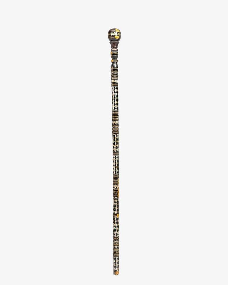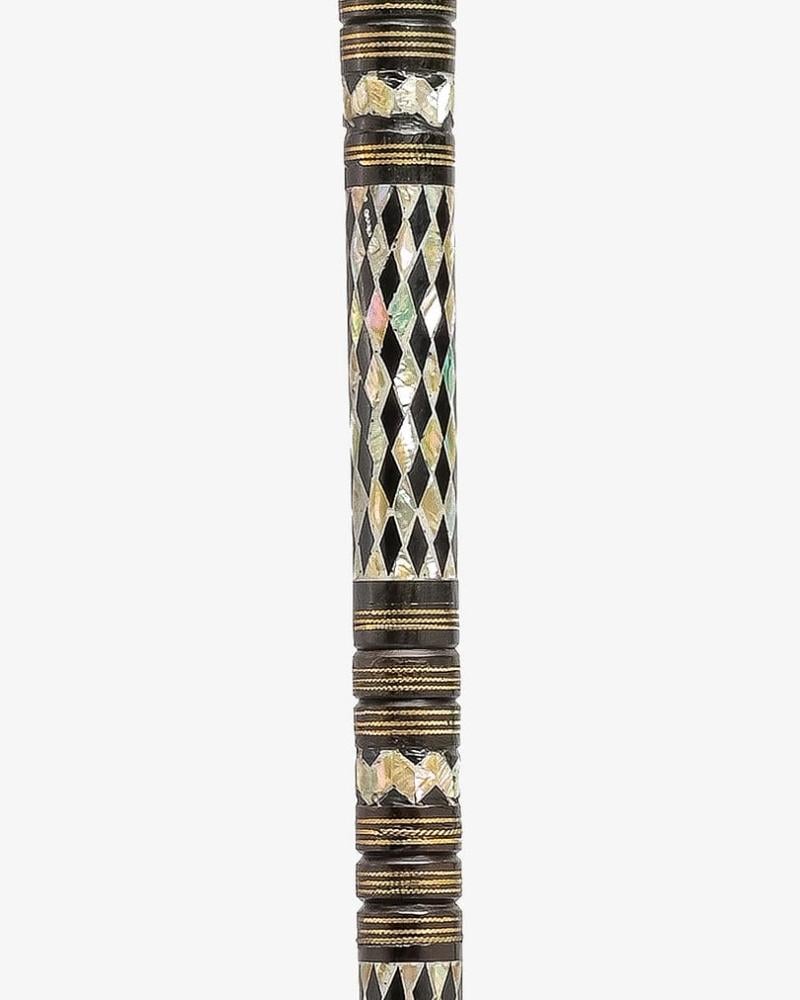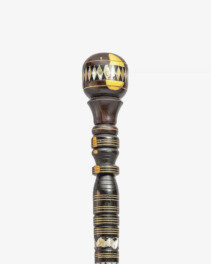 A crutch made of elegant natural Ebanus wood, professionally inlaid with natural mother-of-pearl, with a round handle, handmade by the most skilled craftsmen specialized in manufacturing crutches made of natural wood. It has been professionally polished, multi-use, and is 95 cm long. It is suitable for social occasions for all tastes. (The box is not included with the crutch)