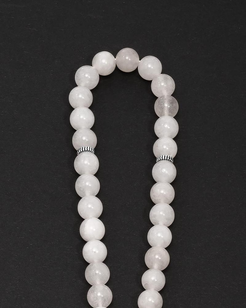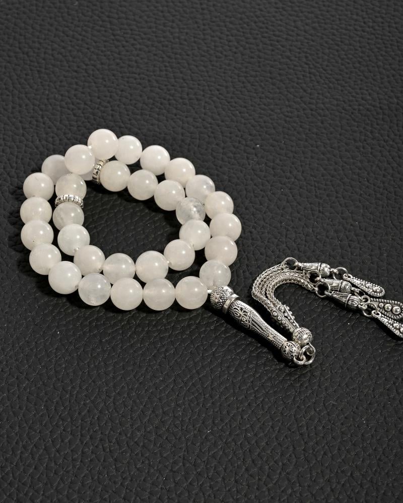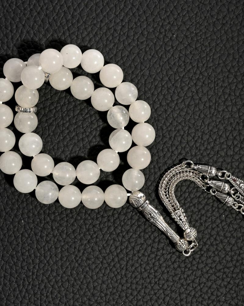 Natural white jade stone rosary, with expertly polished round stones with a smooth texture and attractive colors, designed to show the elegance of its owner, his strong presence, elegance and high taste. It is one of the most beautiful, elegant and formal types of white jade stone rosaries in its color and appearance. It is ideal to suit all tastes and ages.