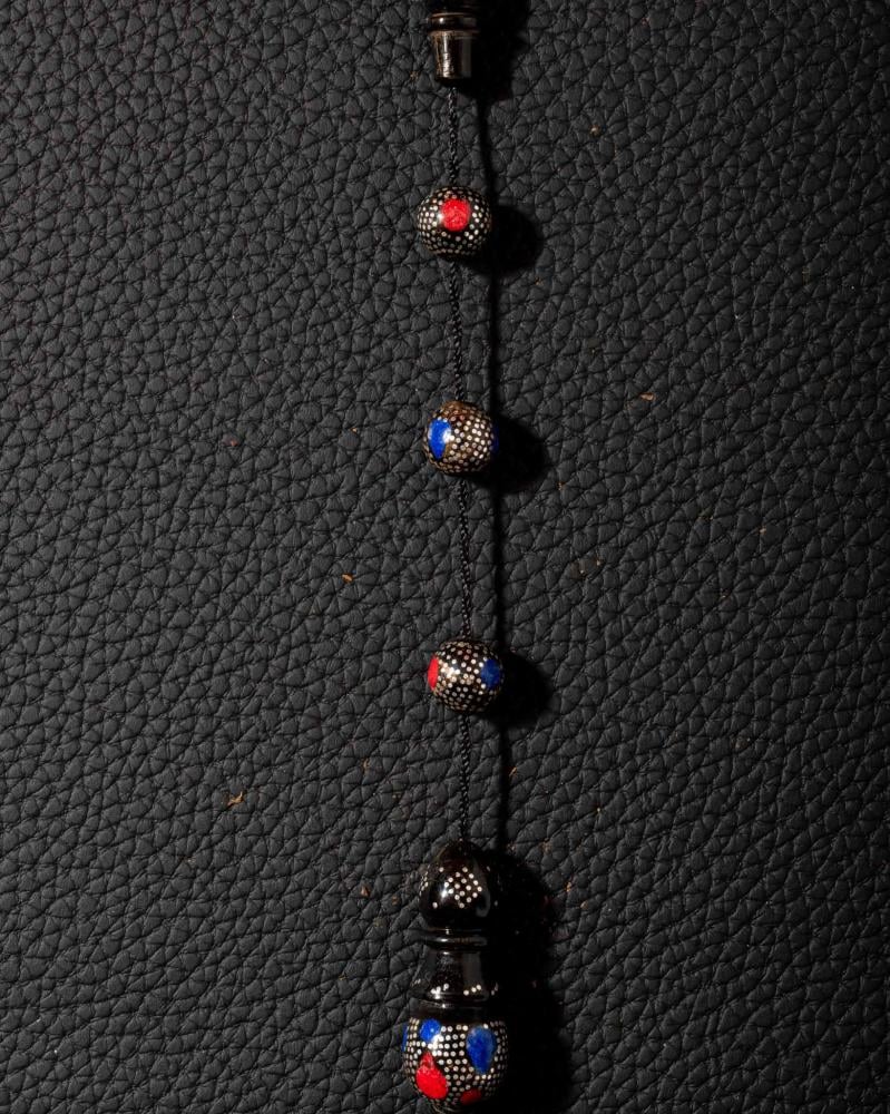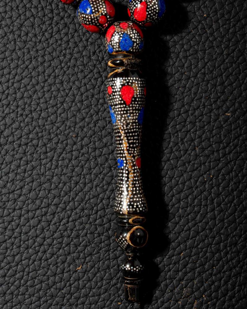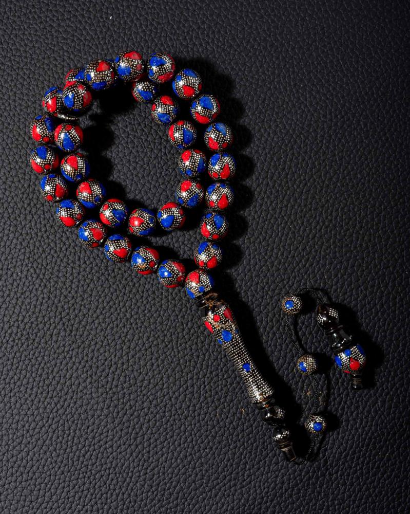 A luxurious and rare rosary made of natural yur decorated with silver, coral and lapis lazuli, featuring a harmonious and stunning shape that makes it look like no other. This rosary is handcrafted to highlight the elegance and luxury of its owner, and add a touch of elegance and beauty to his appearance. A wonderful design that suits all tastes and adds a touch of beauty and distinction to your appearance. There is no doubt that this rosary will be a wonderful and distinctive addition to your personal collection.