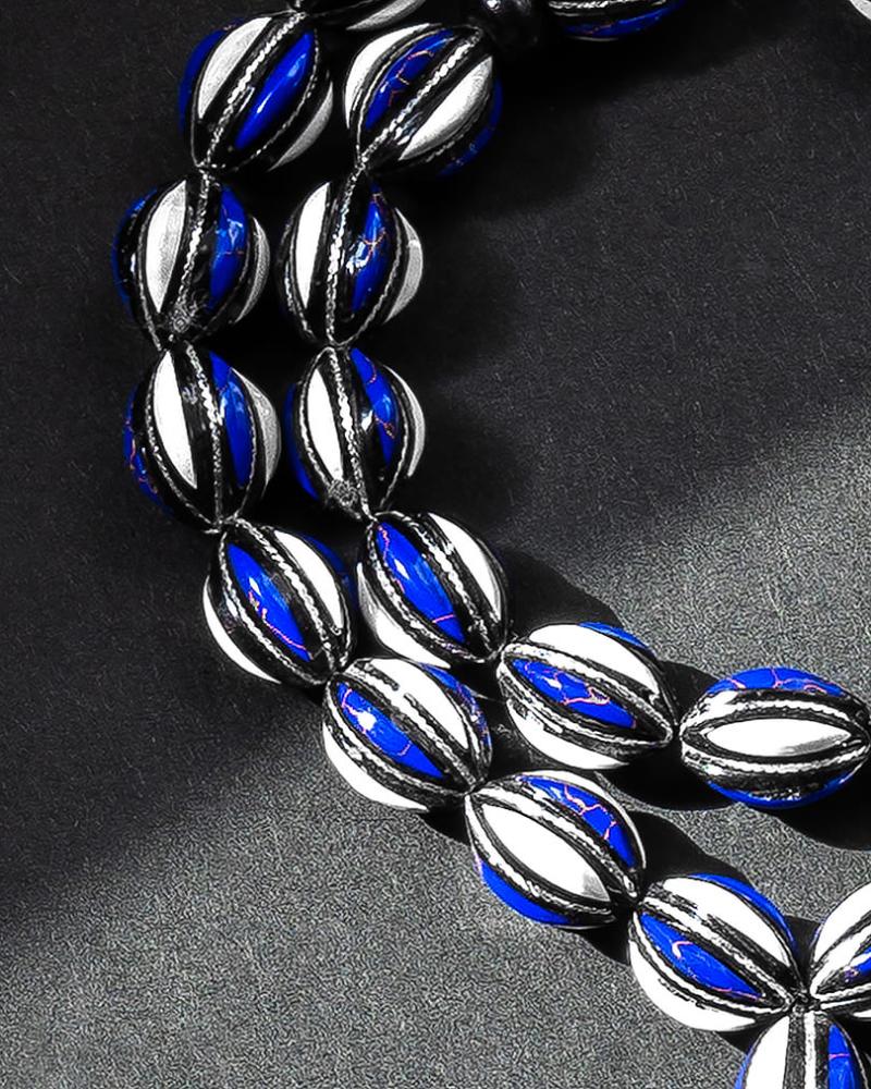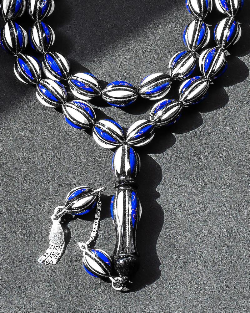 A luxurious and rare rosary made of natural yur, pure silver and rare lapis lazuli, featuring a harmonious oval shape that makes it look like no other. This rosary is handcrafted to highlight the elegance and luxury of its owner, and add a touch of elegance and beauty to his appearance. A wonderful design that suits all tastes and adds a touch of beauty and distinction to your appearance. There is no doubt that this rosary will be a wonderful and distinctive addition to your personal collection.