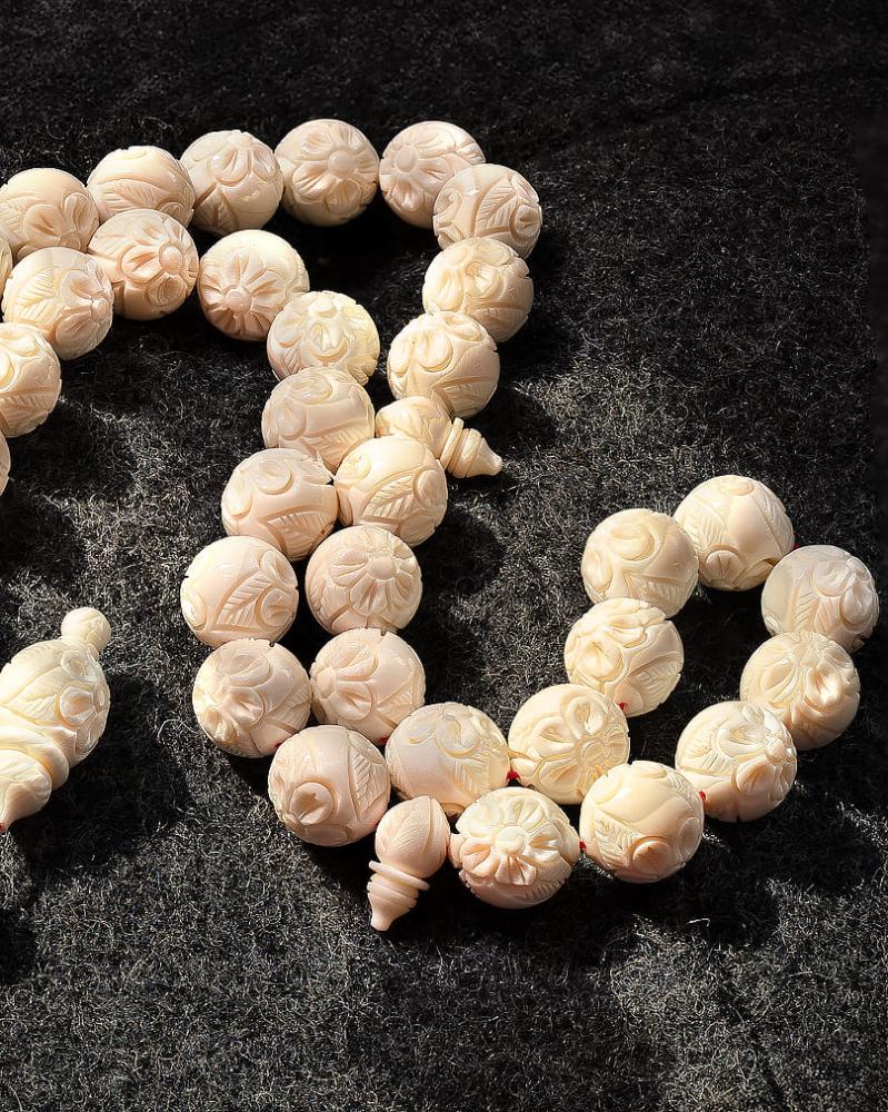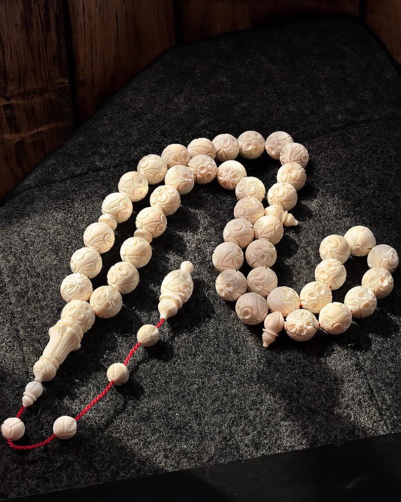 A rare rosary made of hippopotamus tusk in a luxurious white color with engraving, crafted with precision and mastery, making it a unique piece of art. With its harmonious circular design and soft texture, which gives it a special appeal. This rosary is characterized by its beauty and elegance, making it ideal for formal occasions. It features an attractive color and a sophisticated appearance, making it an ideal choice for those looking for elegance and distinction.
