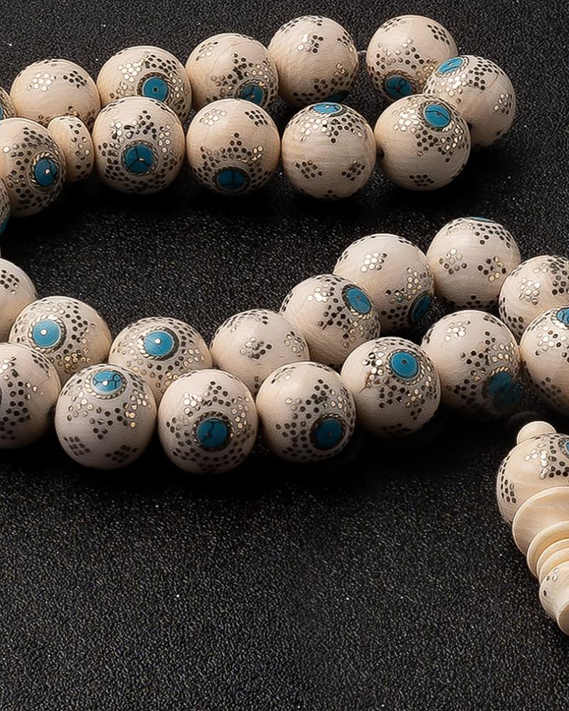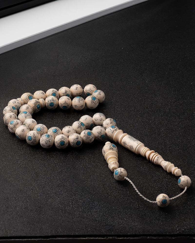 A luxurious and rare ivory (elephant tusk) rosary engraved with silver and turquoise, featuring a harmonious circular shape that makes it look like no other. This rosary is handcrafted to highlight the elegance and luxury of its owner, and add a touch of elegance and beauty to his appearance. The ivory used in its manufacture retains its quality and beauty for a long time, making it a unique and elegant piece that adds a touch of luxury to any look. A wonderful design that suits all tastes and adds a touch of beauty and distinction to your appearance. There is no doubt that this rosary will be a wonderful and distinctive addition to your personal collection.