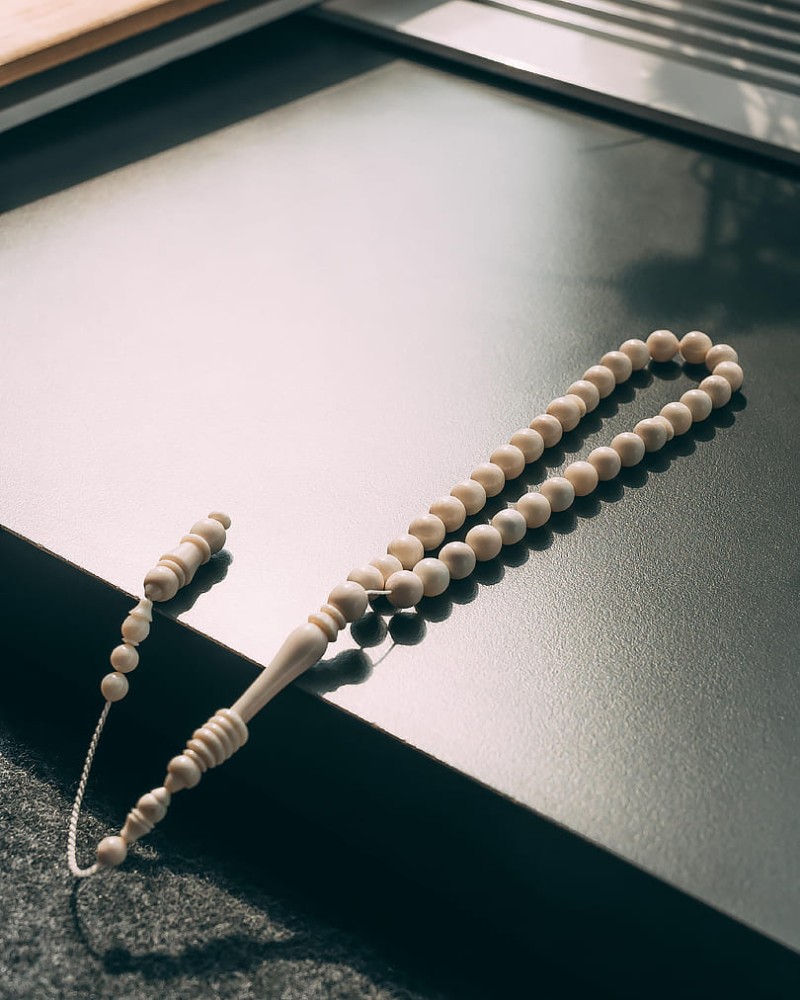 A rare white ivory (elephant tusk) rosary, round and smooth in texture, handmade, designed to show off the elegance of its owner. It is one of the most famous rosaries distinguished by ivory (elephant tusk) that lasts for a long time, maintaining the same quality. It has 33 beads, 7 mm, weighing 13.39 grams. It is beautiful, elegant and formal in its color and appearance for a distinctive extension to suit all tastes.