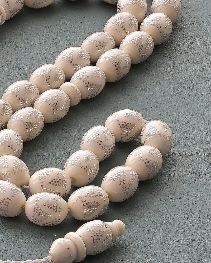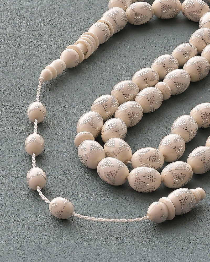 A luxurious and rare ivory rosary engraved with pure silver, featuring a meticulously conical design and a harmonious oval shape that makes it look like no other. This rosary is handcrafted to highlight the elegance and luxury of its owner, and add a touch of elegance and beauty to his appearance. The ivory used in its manufacture retains its quality and beauty for a long time, making it a unique and elegant piece that adds a touch of luxury to any look. A wonderful design that suits all tastes and adds a touch of beauty and distinction to your appearance. There is no doubt that this rosary will be a wonderful and distinctive addition to your personal collection.