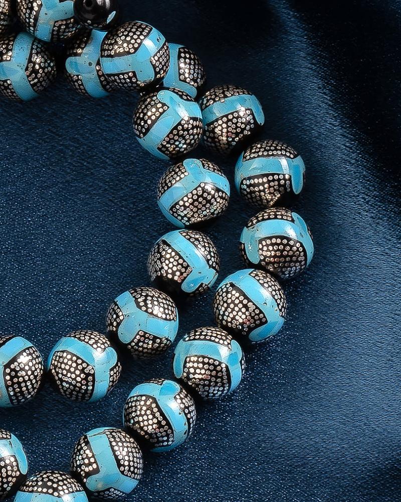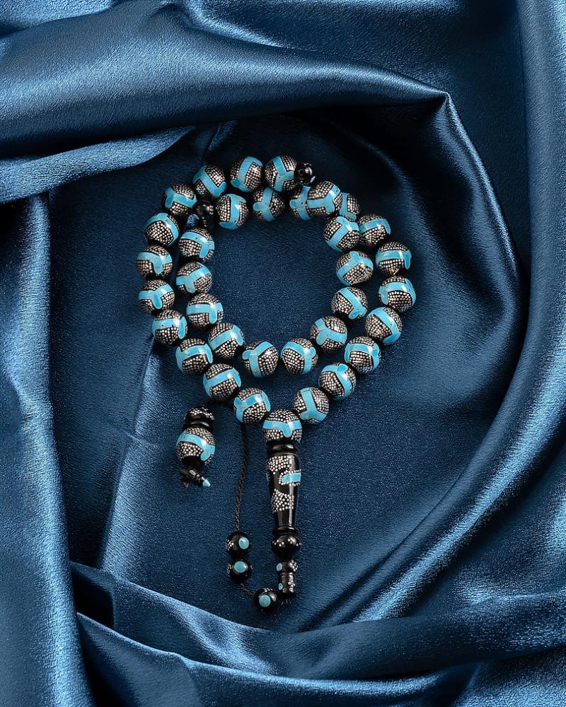 A unique rosary, made of natural cocoa wood engraved with pure silver and rare turquoise. This rosary is characterized by its smooth and homogeneous texture, and it was handcrafted with the utmost precision to highlight the beauty of the work and maintain its high quality for a long time. It comes with a beautiful, elegant and formal design in its color and appearance, making it an ideal choice for those looking for a distinctive and elegant touch that suits all tastes.
