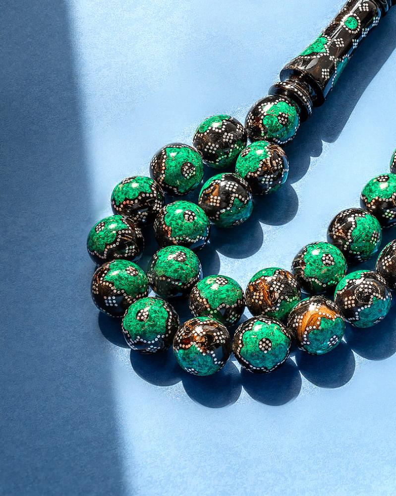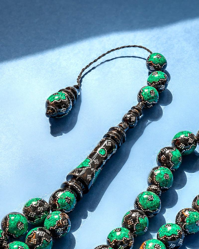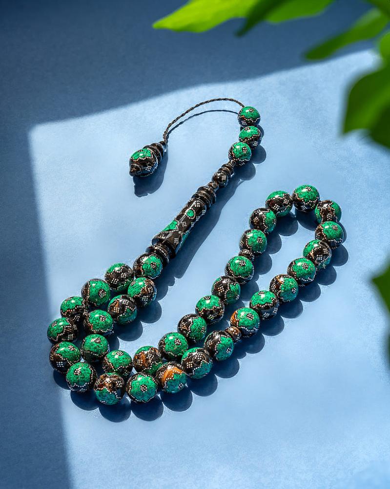 A luxurious and rare rosary made of natural Yusr wood with pure silver, engraved with natural malachite to add a touch of beauty and luxury. It is equipped with a silver-inlaid tassel. It is characterized by its smooth, uniform circular cut, with its dazzling color and attractive texture, making it a unique and distinctive piece of art that adds a touch of elegance and beauty to anyone who wears it.