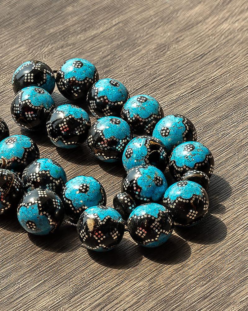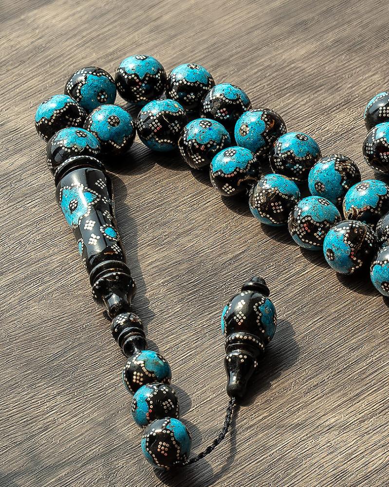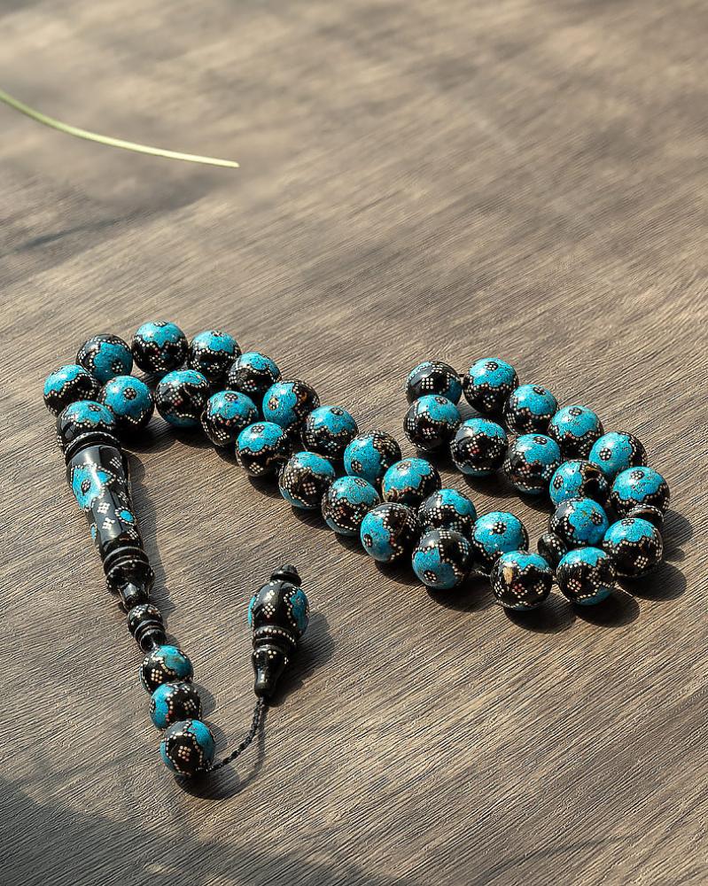 A luxurious and rare rosary made of natural Yusr wood with pure silver, decorated with natural turquoise to add a touch of beauty and luxury. It is equipped with a silver-inlaid tassel. It is characterized by its smooth, uniform circular cut, with its dazzling color and attractive texture, making it a unique and distinctive piece of art that adds a touch of elegance and beauty to anyone who wears it.