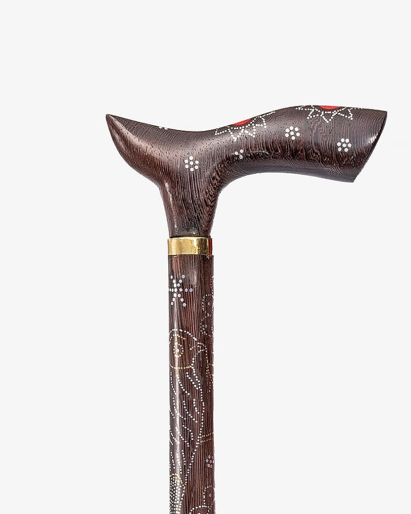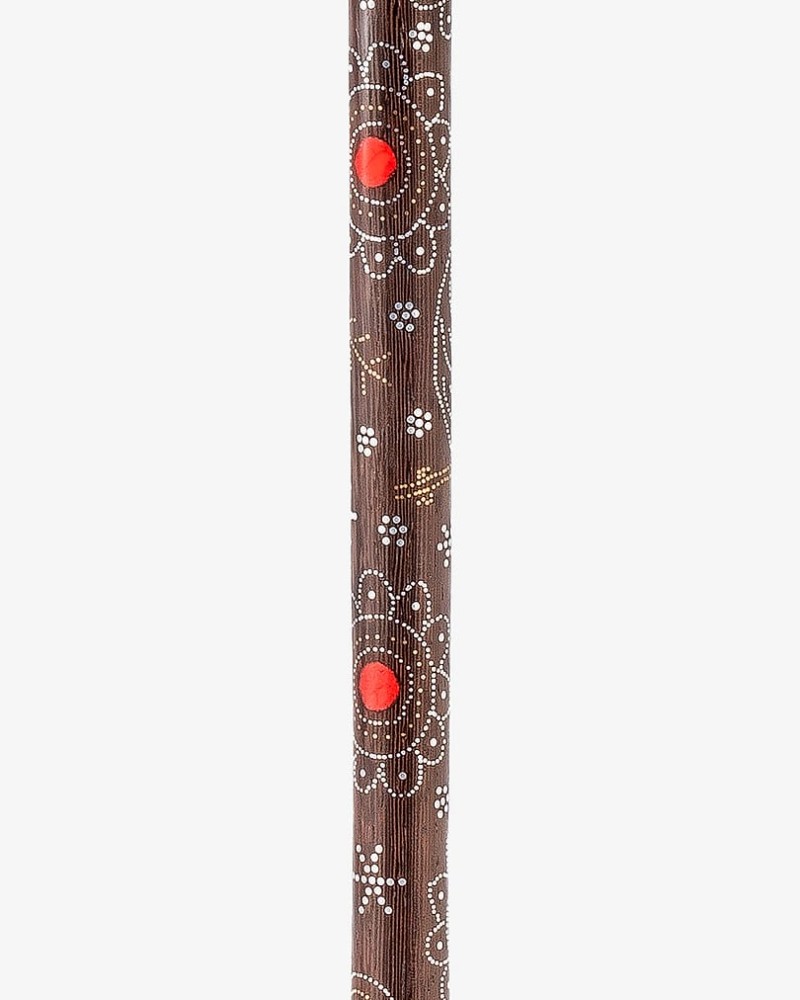 A crutch made of natural Venge wood, inlaid with red coral and engraved with soft copper, with a longitudinal handle, handmade by the most skilled craftsmen specialized in manufacturing crutches from natural wood. It has been professionally polished and has multiple uses, 96 cm long and thick. It is suitable for social occasions for all tastes.