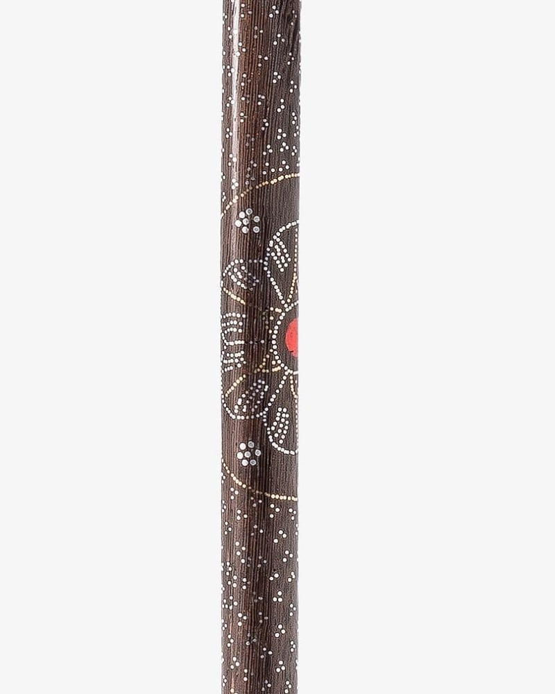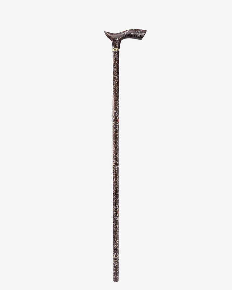 A crutch made of natural Venge wood, inlaid with red coral and engraved with soft copper, with a longitudinal handle, handmade by the most skilled craftsmen specialized in manufacturing crutches from natural wood. It has been professionally polished and has multiple uses, 96 cm long and thick. It is suitable for social occasions for all tastes.